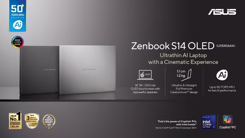 ASUS secara resmi meluncurkan model Zenbook S14 OLED 2026 UX5406AA di Jakarta kemarin. Laptop ini menjadi yang pertama menggunakan prosesor Intel Core Ultra Seri 3 di Indonesia. Arsitektur Panther Lake membuat pemrosesan AI lebih efisien dan cepat secara lokal. Hal ini menjawab kebutuhan komputasi masa depan yang semakin canggih.