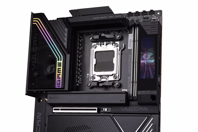 Tampilan fisik motherboard ini tetap mempertahankan estetika futuristik khas seri Vulcan. Warna hitam pekat mendominasi seluruh permukaan dengan sentuhan heatsink logam berlapis yang kokoh. Desain ini tidak hanya garang tetapi juga mendukung efisiensi pendinginan yang maksimal. Struktur sirip pendingin memastikan suhu tetap stabil meski digunakan untuk beban kerja berat.
