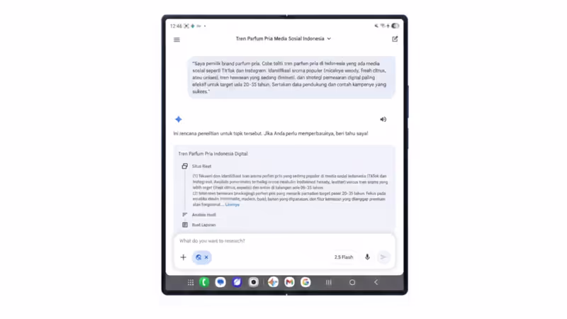 Di tengah tekanan persaingan bisnis yang dinamis, hanya punya ide saja tak cukup. Informasi riset yang tersebar di banyak tab browser seringkali menyulitkan proses pengambilan keputusan. Galaxy Z Fold7 hadir untuk menjawab tantangan itu: Gemini Deep Research menarik data dari ratusan sumber tepercaya, lalu menyusunnya jadi analisis komprehensif dalam hitungan detik.