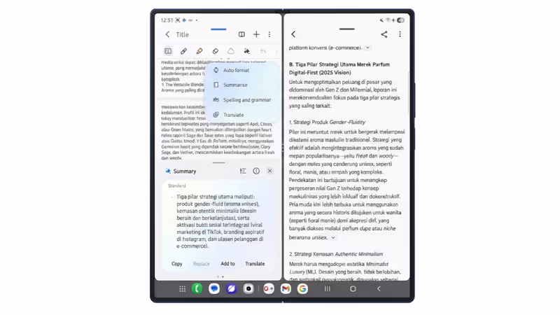 Setelah riset selesai, Galaxy AI-nya tidak berhenti di situ. Fitur Note Assist otomatis merapikan catatan riset menjadi poin-poin yang rapi dan mudah dibagikan ke tim. Ia juga bisa mengecek ejaan, merangkum dokumen panjang, dan menerjemahkan catatan ke bahasa lain jika diperlukan. Kombinasi ini mendukung alur kerja kreatif sekaligus strategis dalam satu layar besar Fold7.