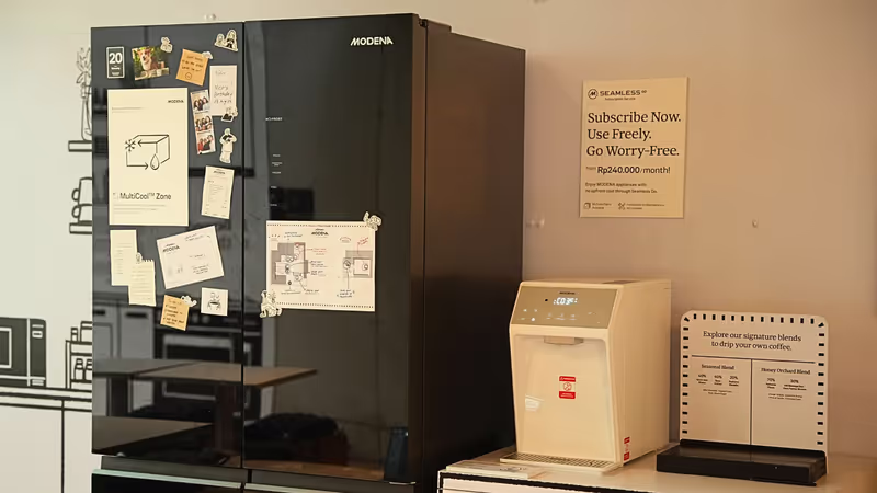 Salah satu daya tarik utama adalah kehadiran produk-produk MODENA yang terintegrasi dengan aplikasi smart home. Kulkas MODENA dengan desain elegan tak hanya menjaga kesegaran makanan, tetapi juga menjadi spot foto favorit pengunjung. RO Water Purifier memastikan air murni untuk kopi yang lebih nikmat. Sementara itu, Air Purifier dan Robot Vacuum menjaga udara bersih serta lantai bebas debu.
