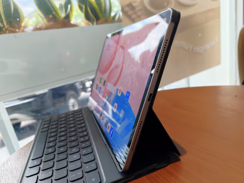 Port USB-C berada di sisi bawah perangkat, digunakan untuk pengisian daya dan transfer data. Di sisi yang sama, terdapat dua speaker grill. Tombol power dan volume berada di sisi kanan, memudahkan akses saat memegang tablet dalam orientasi landscape.