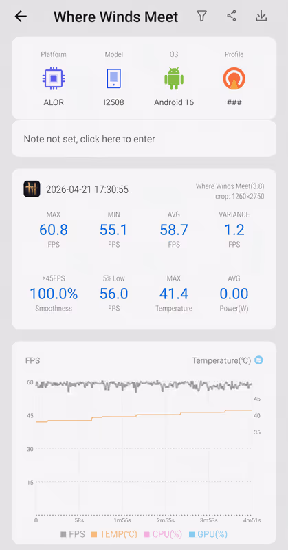 Dalam skenario bermain game, performanya patut diacungi jempol. Bermain game berat Where Winds Meet bisa membuatnya stabil di angka 58 fps pada profile Ultra. Hal ini membuat iQOO 15R akan mampu bermain di frame rate tertinggi pada saat menjalankan game ringan seperti Mobile Legends atau Honors of Kings.