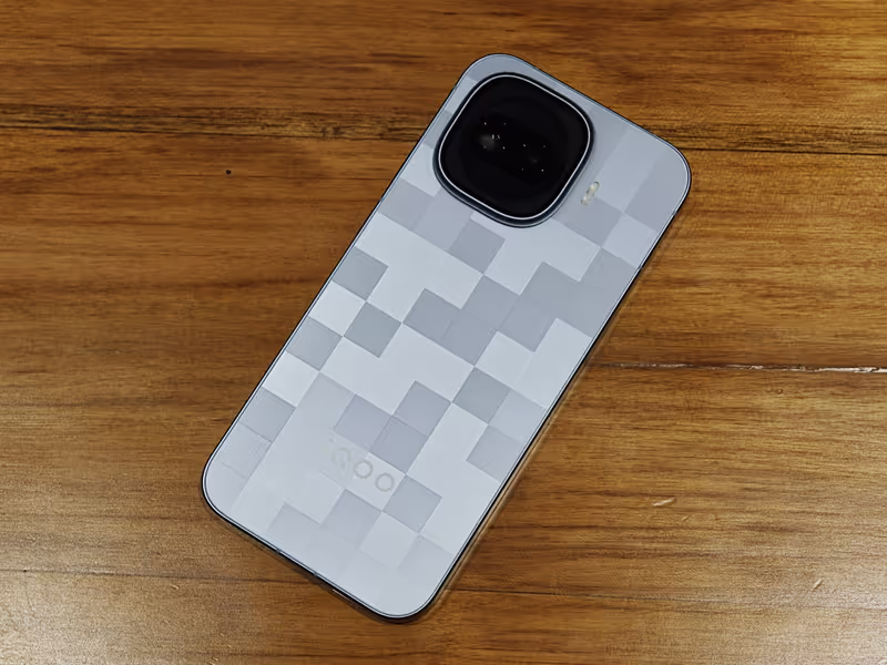 iQOO 15R varian 8-bit Silver tampil dengan estetika yang berbeda dari kebanyakan smartphone gaming. Bagian belakang menggunakan material kaca dengan pola bertekstur halus yang memantulkan cahaya secara dinamis. Warna silver-nya sendiri memiliki nuansa pixelated yang unik, terinspirasi dari estetika retro gaming, sehingga cocok bagi Anda yang menyukai sentuhan nostalgia dalam desain modern.
