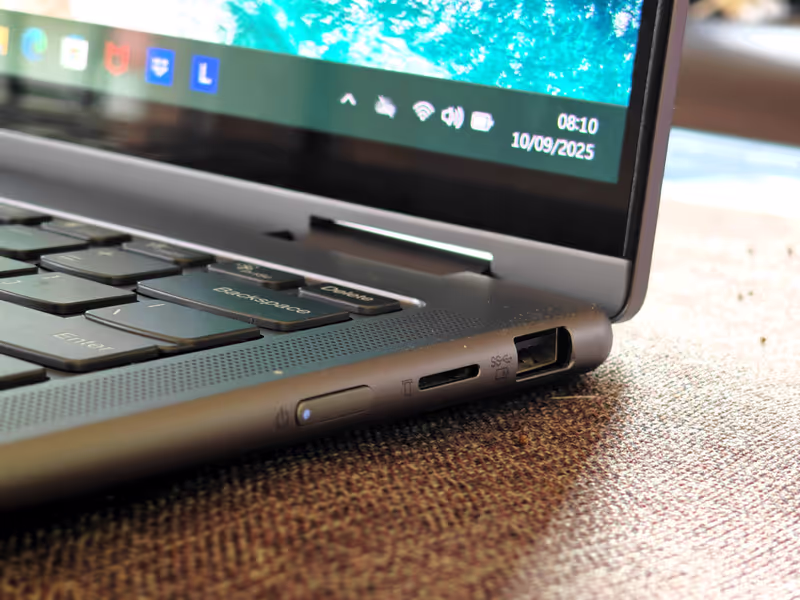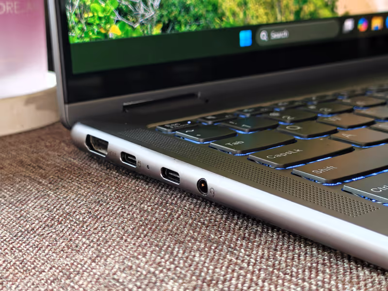 Port pada Yoga 14AHP9 cukup lengkap untuk laptop sekelasnya. Di sisi kiri, Anda akan menemukan HDMI 2.1 (mendukung 4K/60Hz), dua port USB-C (satu USB 3.2 Gen 2 dengan DisplayPort 1.4a dan Power Delivery, satu USB4 40Gbps), serta jack audio 3,5 mm. Di sisi kanan, ada port USB-A 3.2 Gen 1, microSD card reader, dan tombol power.