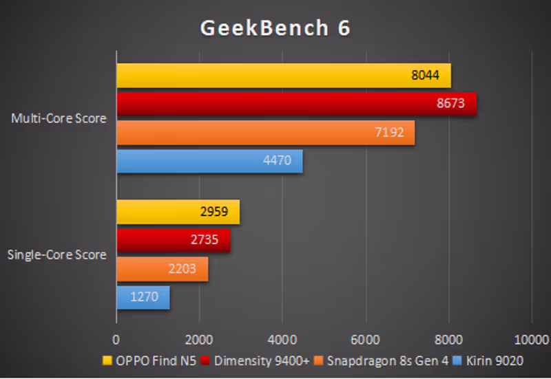 Performa OPPO Find N5 didukung oleh platform mobile Qualcomm Snapdragon 8 Elite, yang merupakan chipset paling mutakhir dari Qualcomm 2. Chipset ini memiliki CPU 7 inti yang powerful dan GPU Adreno 830 @1100MHz, yang dirancang untuk menangani tugas-tugas berat seperti gaming AAA dan editing video. Sayang memang, standarnya Snapdragon 8 Elite memiliki 8 core, dan OPPO mematikan satu core Oryon V2 Phoenix M agar suhunya bisa terjaga.