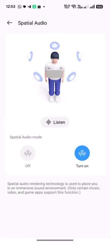 Saya juga mencoba fitur Spatial Audio yang ada pada perangkat ini. Sayangnya, perbedaan suara 360°-nya tidak terlalu terasa. Walaupun begitu, saya masih bisa merasakan suara muncul dari arah mana. Suaranya juga menjadi lebih jernih sehingga saya menjadikan fitur ini sebagai default.