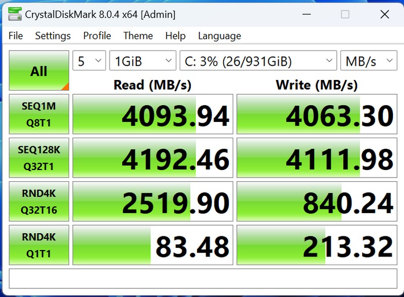 Penyimpanan internal ini menggunakan interface PCI express 4.0 x4 yang mendukung 4 lane. Dalam menguji SSD yang satu ini, saya menggunakan sebuah laptop dengan prosesor Intel Core i5 1135G7 yang juga sudah mendukung PCIe 4.0 x4.