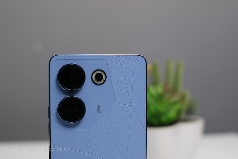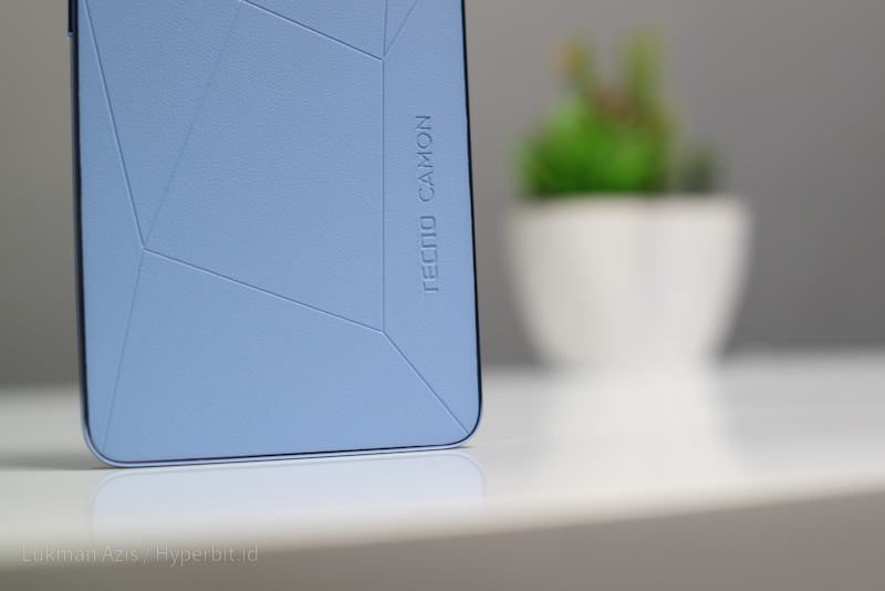 Aspek yang membuat penutup belakang Camon 20 Pro terlihat semakin keren adalah penggunaan lapisan kulit imitasi yang bertekstur dengan pola leci. Unit review Tecno Camon 20 Pro yang saya pegang varian warna Serenity Blue dengan bingkai datar berwarna senada dan mempunyai sentuhan akhir glossy, tampak mewah tetapi cepat kotor jika tidak memakai case.