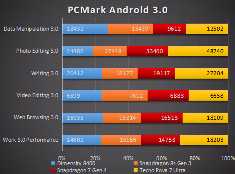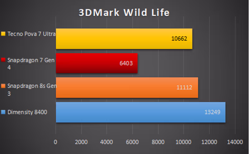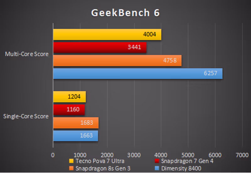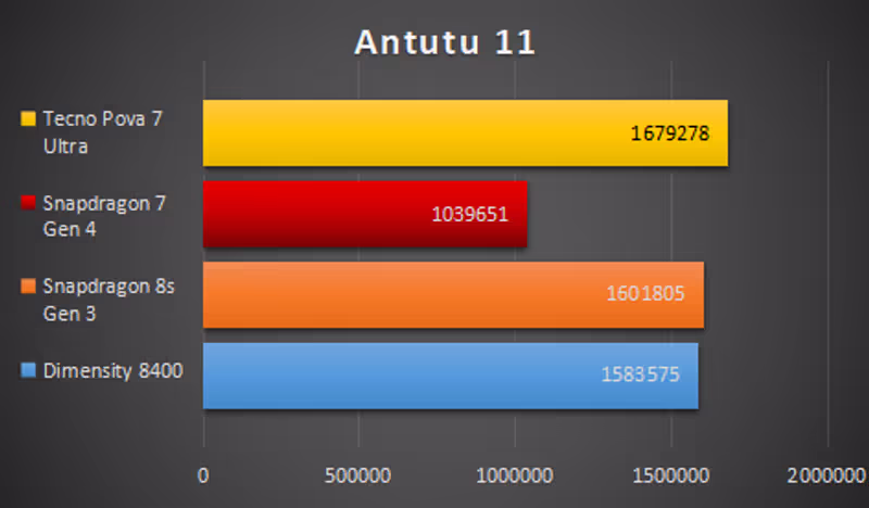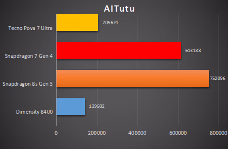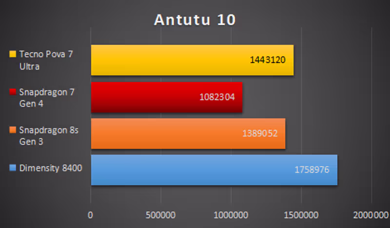 Performa adalah salah satu aspek terkuat dari Tecno Pova 7 Ultra 5G. Perangkat ini ditenagai oleh chipset MediaTek Dimensity 8350 Ultimate yang dibangun pada proses fabrikasi 4nm. SoC nya menggunakan ARM Cortex-A715 berkecepatan 3.35 GHz, 3 core Cortex-A715 berkecepatan 3.20 GHz, dan 4 core Cortex-A510 di clock 2.20 GHz. Chipset ini merupakan pilihan yang sangat kuat untuk smartphone kelas menengah, menjanjikan performa tinggi yang efisien.