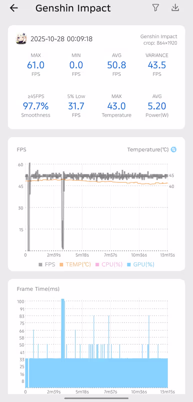 Dalam gaming, perangkat ini unggul dengan dukungan refresh rate hingga 120 FPS di judul seperti Genshin Impact, berkat GPU Mali-G720 yang efisien. Dalam Genshin Impact, perangkat ini mampu berjalan di rata-rata 50,8 fps pada setting paling tinggi.