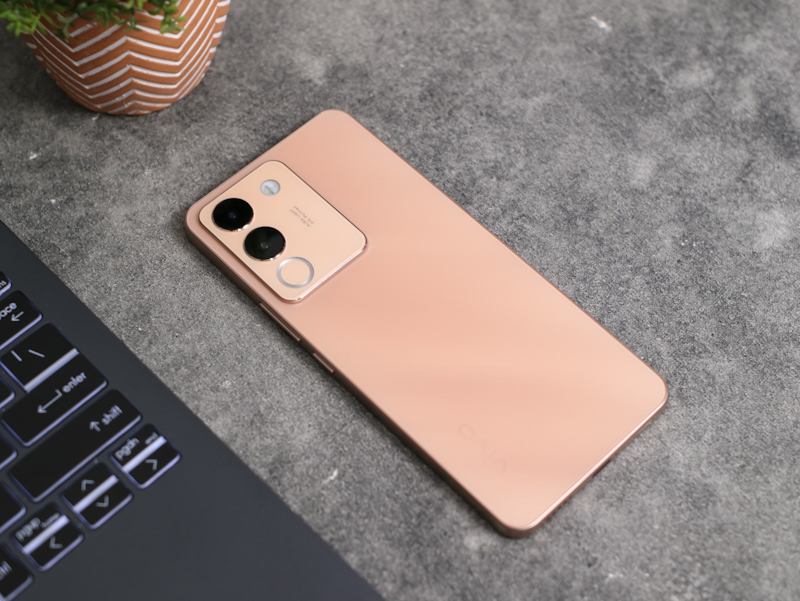 Unit review vivo V29e 5G yang Hyperbit uji berwarna Rose Gold, yang terinspirasi dari cahaya matahari di Bumi Nusantara. Penampang belakangnya berlapis Flourite AG, yang menghadirkan efek bekerlapan yang memukau dan bebas sidik jari.