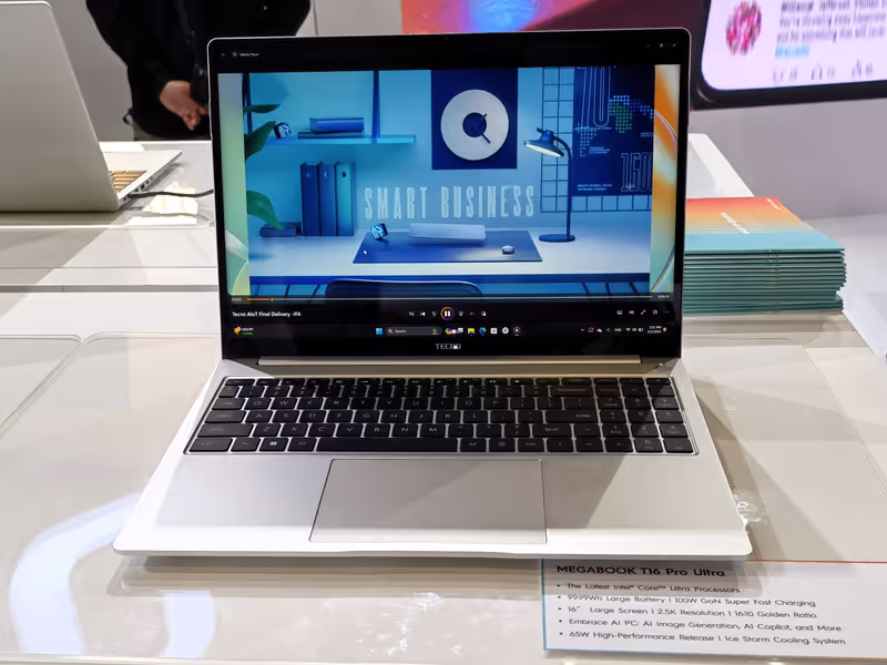 Selain itu, ada pula MegaBook T16 Pro 2024 Ultra yang merupakan PC AI pertama dari Tecno, menampilkan prosesor Intel Core Ultra 7 dengan fitur AI dan opsi hingga 32GB RAM LPDDR5 serta penyimpanan 1TB. Baterainya memiliki kapasitas 99.99 Wh dengan pengisian 100 watt GAN.