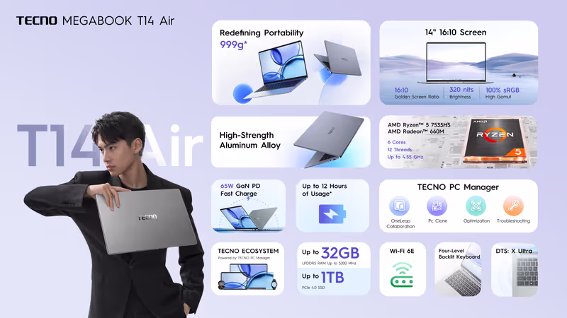 Pilihan warna dan desain yang elegan membuatnya cocok untuk segala kalangan. Mahasiswa, pekerja kreatif, hingga eksekutif muda bisa mengandalkan perangkat ini. Laptop ini bukan sekadar alat kerja, tetapi juga penunjang gaya hidup. Tecno MegaBook T14 Air siap menetapkan standar baru laptop ultra-portabel.