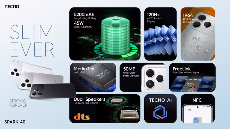 Daya tarik Spark 40 terlihat dari perpaduan performa harian dan desain yang tetap stylish. Perangkat ini membawa baterai 5.200 mAh yang sama dengan versi pro sehingga memberikan daya tahan lebih panjang. Pengisian cepat 45W membantu pengguna mengisi daya tanpa menunggu lama. Teknologi reverse wired charging juga tersedia untuk pengisian perangkat lain.