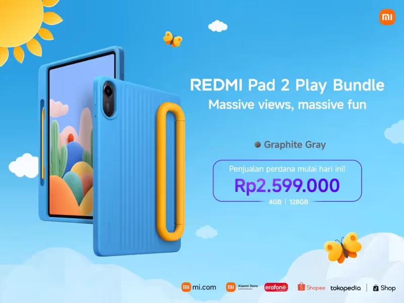 Redmi Pad 2 Play Bundle tersedia dengan harga Rp2.599.000. Produk ini dapat ditemukan di berbagai kanal penjualan resmi Xiaomi Indonesia, baik secara online melalui Mi.com, Tokopedia, Shopee, TikTok Shop, maupun secara offline di Xiaomi Store dan Erafone.